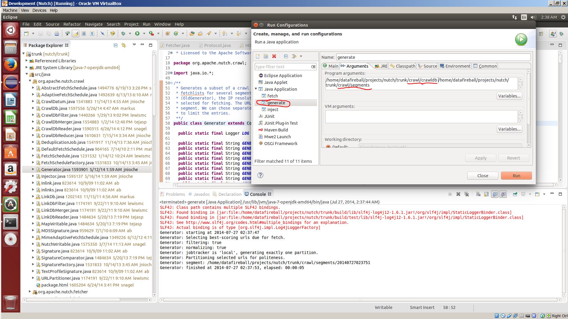 I injected one URL(http://datafireball.com) into crawldb following Tejas tutorial. Then I generated the fetchlist by running “org.apache.nutch.crawl.Generator” as the Main class and pass the crawldb and segments folder as the program arguments.