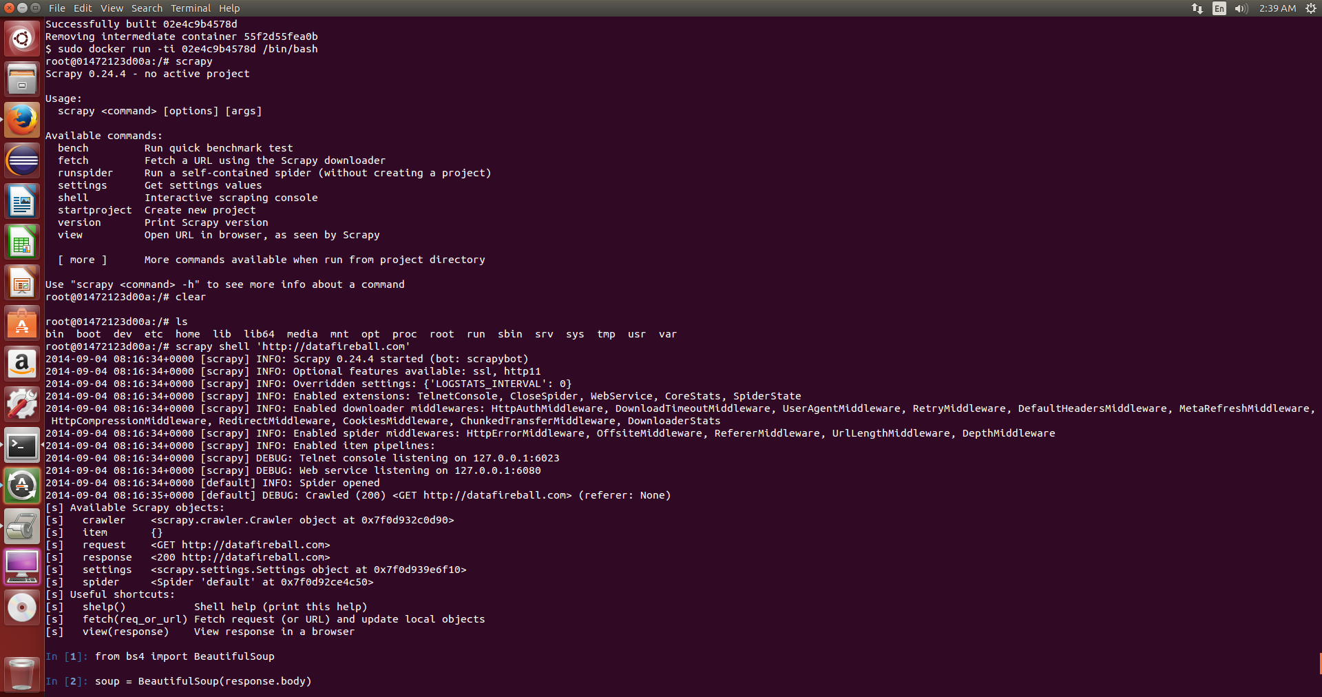 I wrote a Dockerfile which will follow the Scrapy installation instruction for Ubuntu. I had a hard time using pip to make it work, some errors like missing openssl/xxx.h.. Anyway, now you have a recipe to build the Image which contains BeautifulSoup4, Scrapy and iPython.