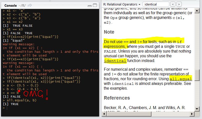 However, in R, I just noticed that even in the documentation of “==”, they clearly write down a misunderstanding of “==” will lead to a disaster.