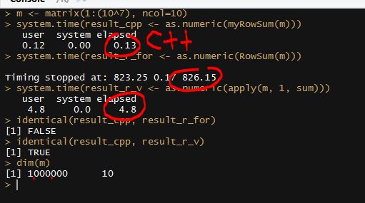 I was following the “High Performance Computing using Rcpp” in Hadley Wichham’s Advanced R. I did an experiment in R which there are two functions, one function myRowSum written in C++, and the other one written in plain R. As you can see from the code, they are very similar, same variable name, same for loop, same logic…etc. However, I have been totally blown away by the difference between total time.