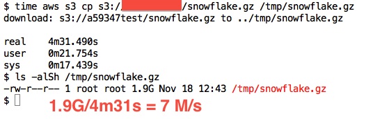 In that way I can quickly estimate that 10D/S=10 * 2 / 7 = 3 d, which I might need to think about using AWS import/export. But if my boss told me “dude, you need to load this 10TB data quickly to the S3”. Then I scratch on the back of the napkin that it will take 10 * 10 / 7 ~ 14 days… then I will just ask for 2 hundred bills and walk straight to UPS.