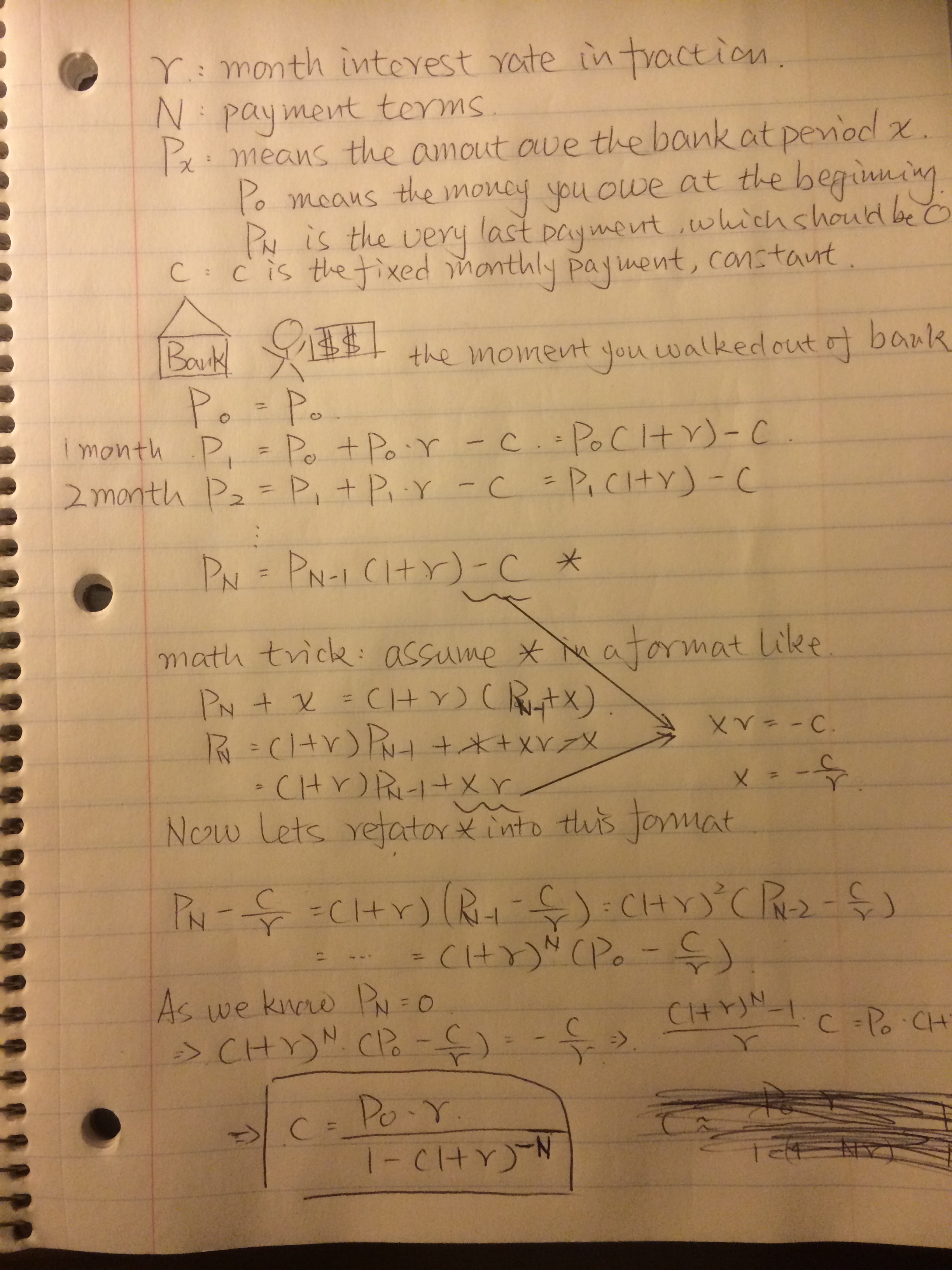 Thanks to Wikipedia, it showed me there is a recursive relation between the consecutive loan payments where P(n) = P(n-1) + P(n-1) * r – c = AmountOwe + Interest – Payment. This is totally different than my assumption that we the principal equally month by month, calculate the interest in that way and evenly distribute them to have a fixed monthly payment. Once we are sure about the equation, it is just a matter of solving the series problem. I am not kidding, this is a problem that could be easily solved by a high school student if you received your education in China. Here is a hand calculation with some math tricks, a bit different from the one in Wikipedia but it works. 🙂