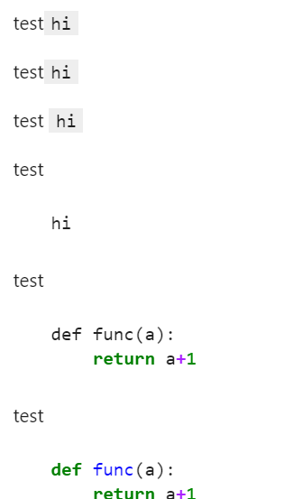 Even if there seems like two new lines between L1 and L4. Due to the very reason mentioned above, Markdown will treat as two paragraphs and only insert a new line. And the fenced code block will be treated as inline, if the opening triple backticks are on its own line, like L11, it will be formatted as a standalone code block with a different formatting. Inline code blocks comes with greyed background while standalone comes with a white background but indented differently. In addition, when you have fenced code block with a programming language next to the open backticks, the text within the code block will be highlighted per the syntax of that programming language.