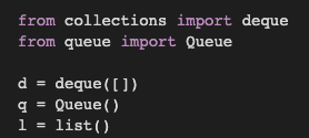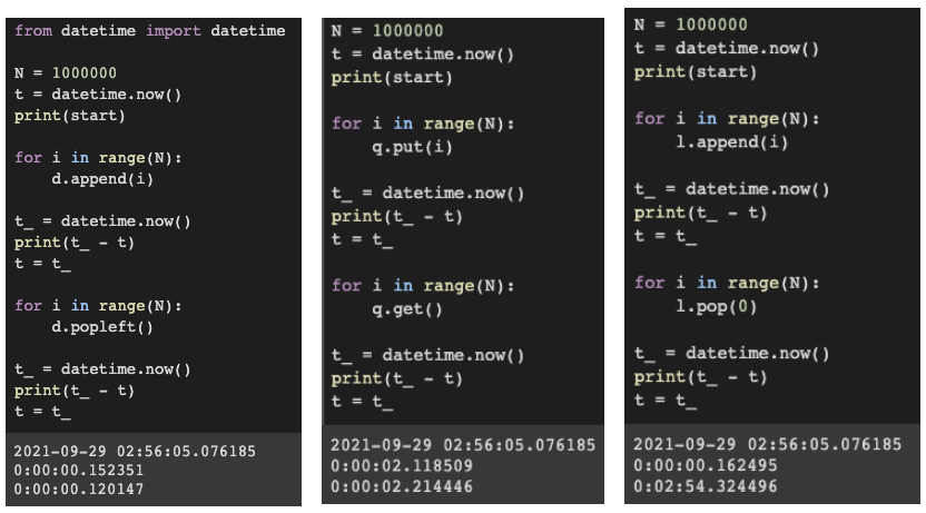 You can find that using the deque data structure achieves the best performance of 152ms to add 1M objects and only 120ms to retrieve all those objects. For the queue.Queue, it took 2.118s (14x slower) to store and 2.214s (18x slower) to get all objects. Last for the list, it is pretty quick to add all the objects 162ms but the pop(0) took close to 3 minutes (1450x slower)!