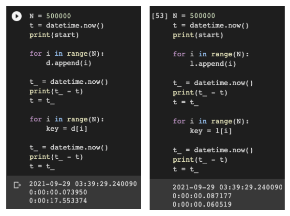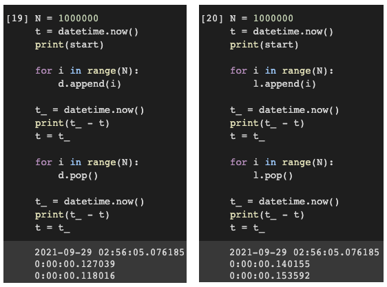 This is another performance test that shows deque’s random access O(n) is much slower (300x slower) than a list O(1).