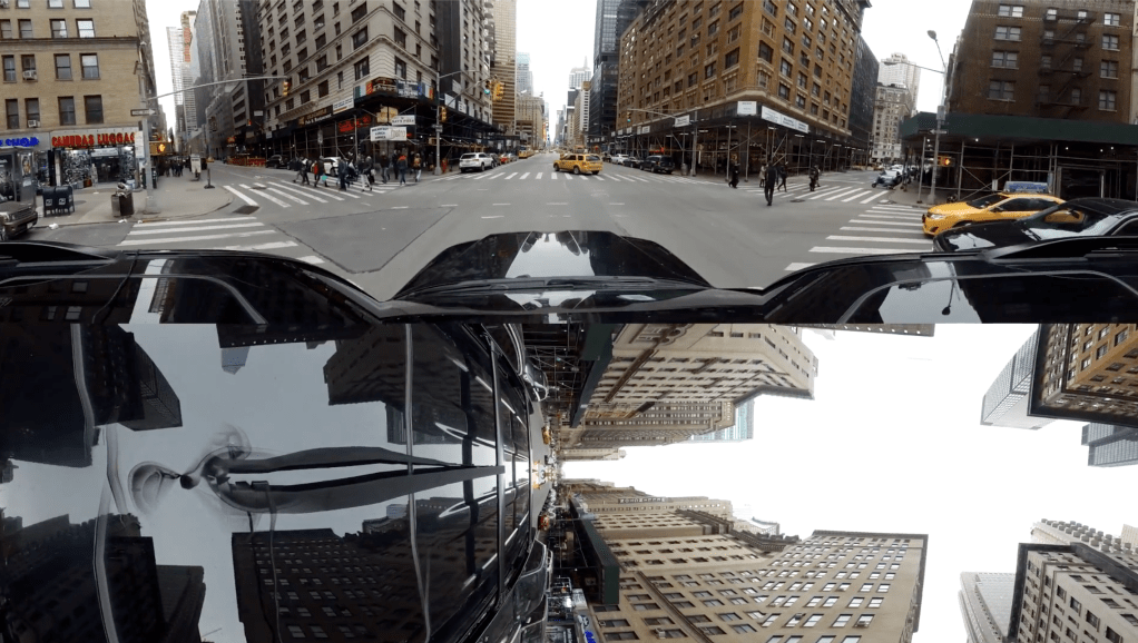 It is easy to notice this video got divided into two halves, the top half includes left, front and right from the point of view of a driver. The lower half is like someone sitting on top of the car facing backwards that incorporated the up, back and down.