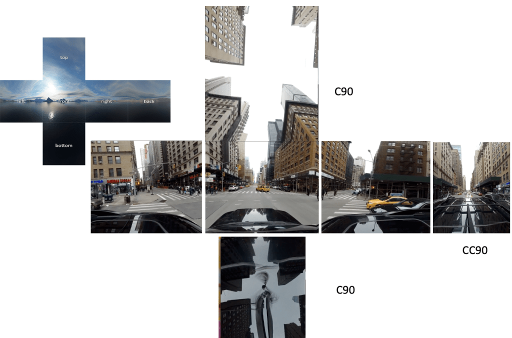 The cube mapping is a very popular environment mapping method to represent the 360 space, after rearranging the tiles, you get something like this. I marked C90 to represent clockwise 90-degree rotation and CC90 for counter clockwise 90 degree. (Note: the bottom view is basically the car hard top which some reflection of the top view, my rotation may be wrong as it is hard to read, all buildings look similar)