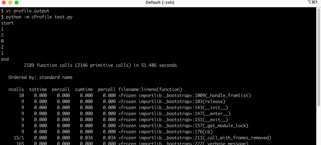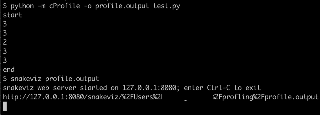 After the cProfile command is executed, the output will be dumped into a separate file profile.output which can be fed to other tools to analyze or visualize.