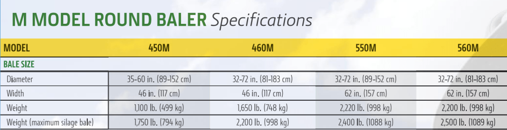 Interestingly, you can find the baler specifications in the user manual. The largest bale is probably packed by 560M with the weight of 1089kg. And volume of 4.13 m^3.