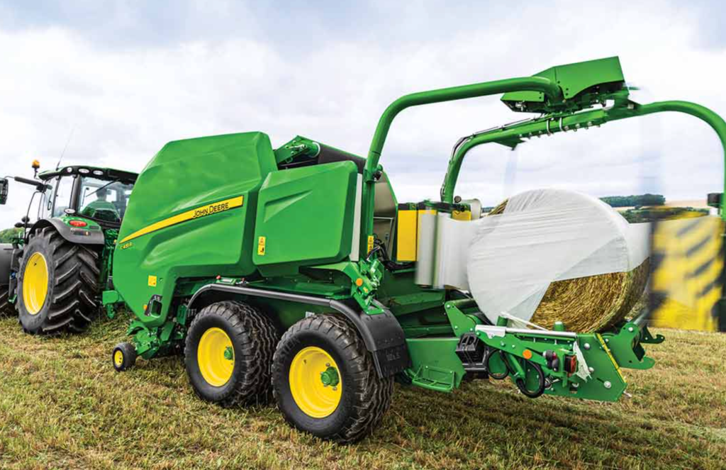 John Deere is one of the larges manufacturers for this kind of industrial machines. The type of machine that pack loose hays into compact hay bales is called baler. For example, 450M round baler.