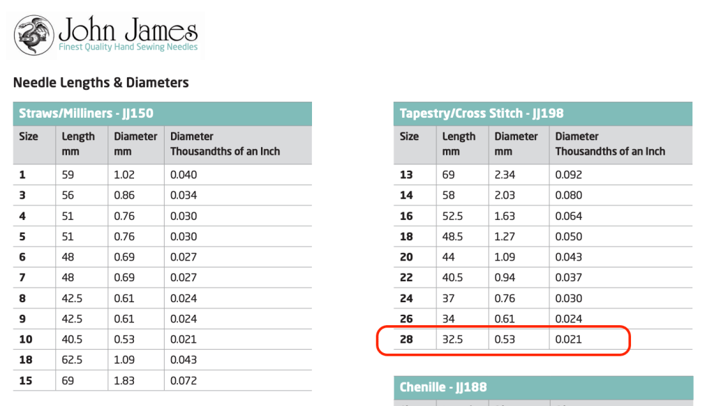 When it comes to needle size, just like different clothes manufacturers have different size chart, different needle manufacturers have their own manual explaining their size system. For example, John and James is a popular UK brand and they have a size chart here. The smallest needle that I can find is their JJ195 for tapestry and cross stitch with size28 of length 32.5mm and diameter of 0.53mm. The volume for a cylinder of that shape is pi * (d/2)^2 * l = 7.17mm^3.