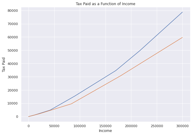 If we look at the tax visually, if we are given a flat tax rate, you should expect a straightline shooting from the bottom left to the top right, and the fact that the lines have different segments and they are curling to the top left is an indication that the marginal tax rate is getting higher and higher.