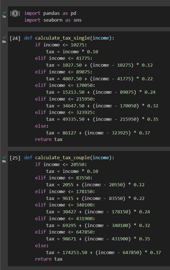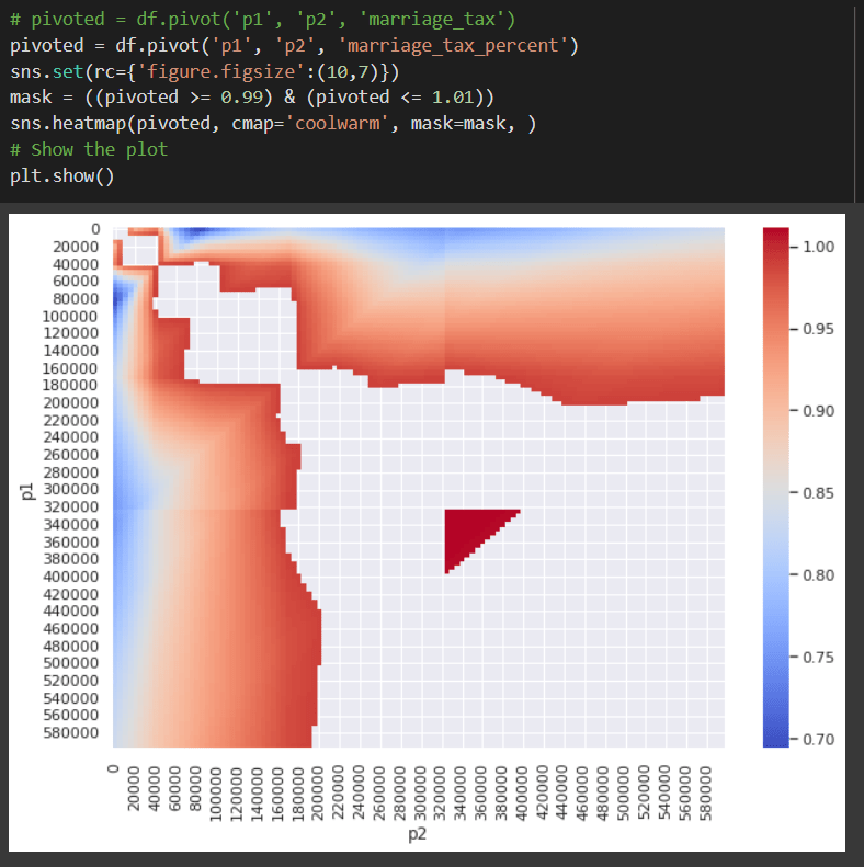 If we imagine a couple and both of them have income, we can simulate how much tax they will have to pay filing separately as singles (don’t get married for tax reasons, stay single) vs get married. We can even iterate through all different scenarios for every possible combination of a couple.