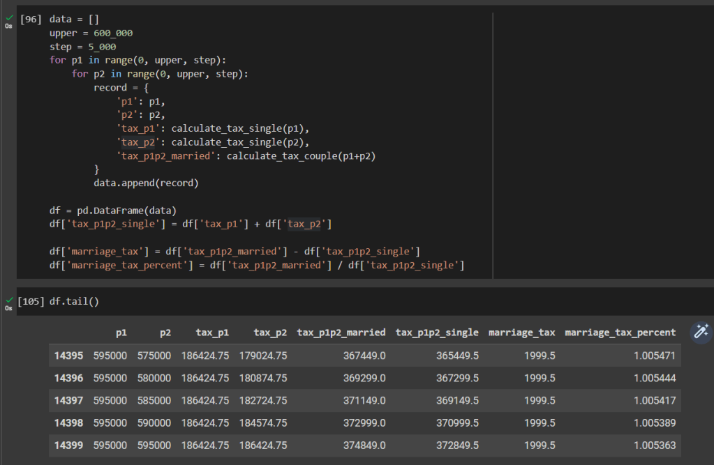 In the code above, the p1 and p2 columns represent different income for each people, tax_p1 and tax_p2 are the taxes they will need to pay file as singles. tax_p1p2_single and tax_p1p2_couple are the total different taxes they owe before and after marriage. In order to understand the numerical differences, we created two new columns. marriage_tax is the additional taxes the couples will have to pay. If you got the newly wedded tax penalty, the value will be positive, if you saved money, it will be negative. Also, the percentage column will represent the proportional difference.