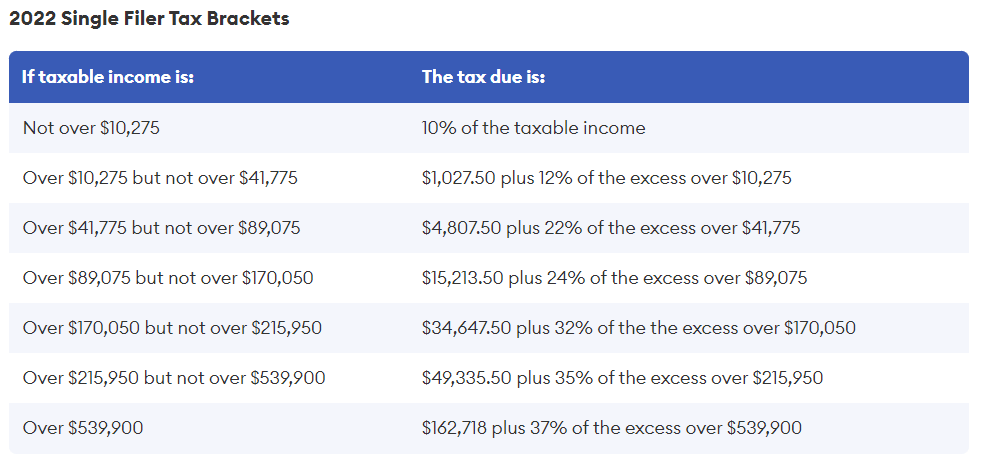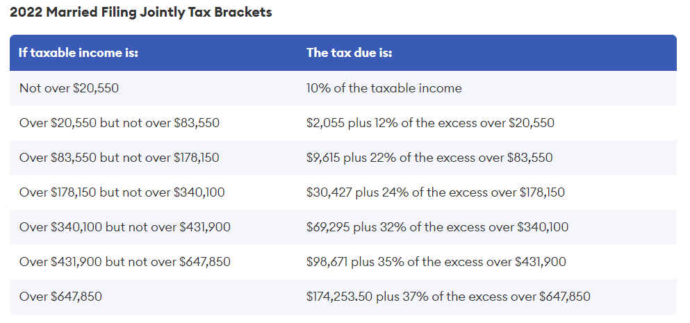 You can easily find tax scheduled for different filing status on the internet. Attached are two screenshots from the 2022 Forbes. The more you earn, the more tax you will have to pay on those excessive income, “$xxx plus a higher percentage of the excess over…”