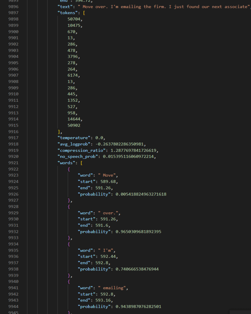 By enabling the word level timestamp “–word_timestamps True”, you can even get the word level prediction.