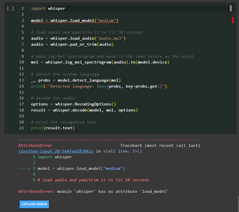 I tried to run the tutorial from whisper documentation but couldn’t seem to get the first step running – call the load_model method. It turned out there is a discrepancy between the whisper library in pypi and the latest in github, the best way is to point pip to the github official account and you should be good to go. eg. pip install git+https://github.com/openai/whisper.git. Otherwise, you should the same error message as me below.