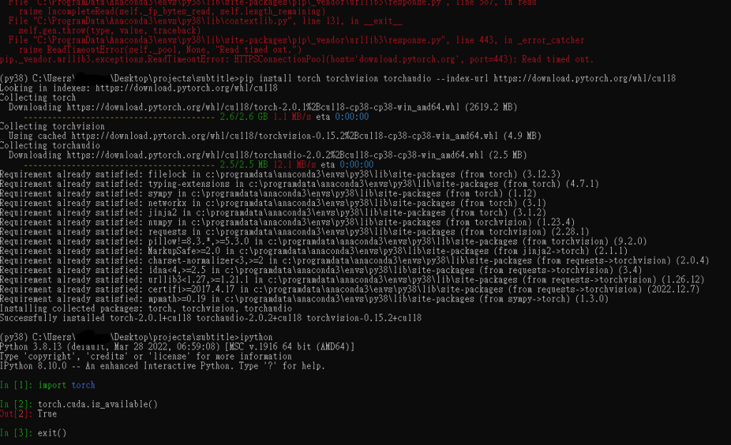 For me, I had to uninstall torch all together first, then follow the pytorch site’s instruction to reinstall again. The installation is a bit time consuming downloading the 2.6GB from wheel for windows. For the first time, it even failed half way through but the second time is the magic. In hindsight, one could relax the timeout to avoid slow downloading related error. After all, you can run the code below to confirm the GPU is working perfectly with pytorch.