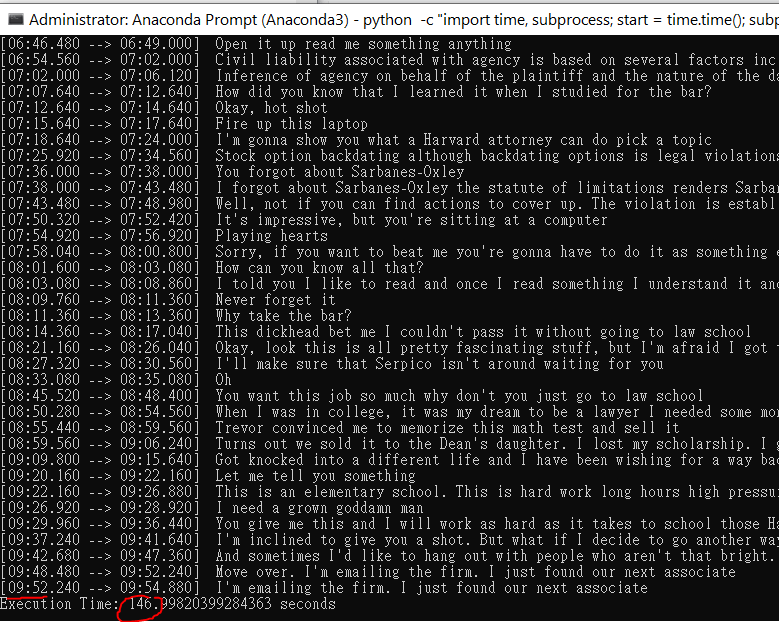 By using a GPU, it took 146seconds to transcribe 9:54 contents, which the ratio is about 3.9x. The bigger this ratio, the faster it is. By using cpu, it took 2001 seconds which is only 0.29x. Using GPU leads to a 10 times performance difference.